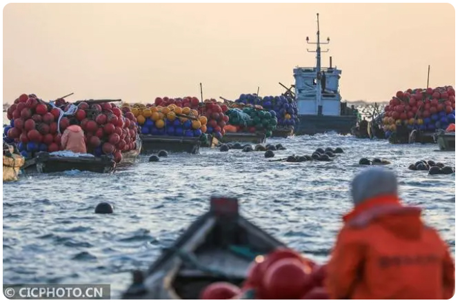 海带“播种”期即将到来。连日来,在山东省荣成市俚岛镇海带养殖区一片繁忙的景象,养殖工人们更换养殖浮漂,整理海带养殖筏架,备战即将开始的海带夹苗播种作业。山东荣成是全国最大的海带产地,养殖面积近十五万亩,养殖面积和产量居全国第一。